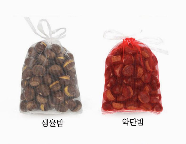 생율은 흰색, 약단밤은 빨간 망에 담겨