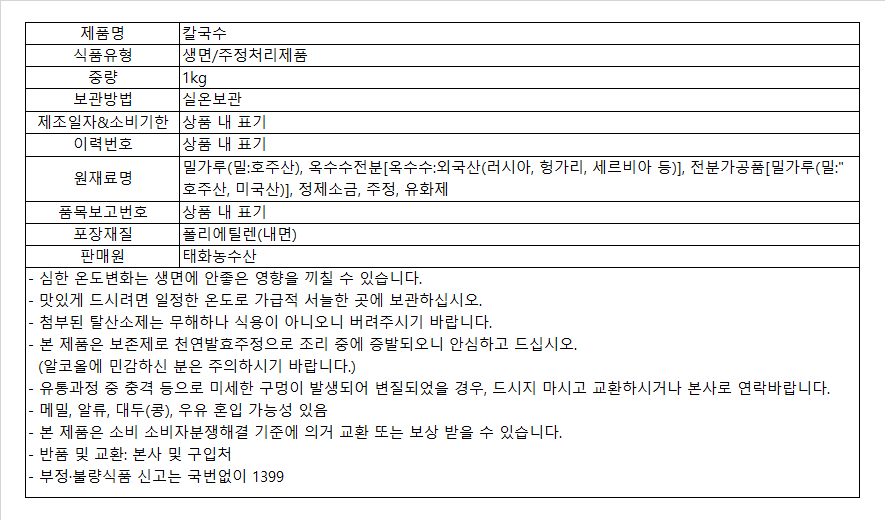 生칼국수 면으로 고급원료만을 엄선하여